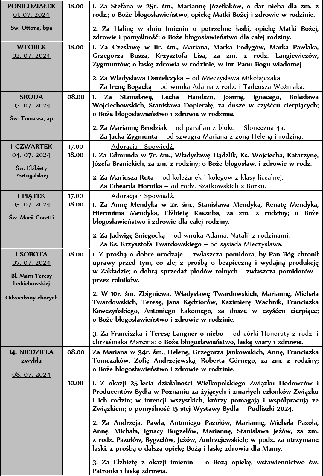 INTENCJE MSZALNE 01. 07. – 07. 07. 2024r.