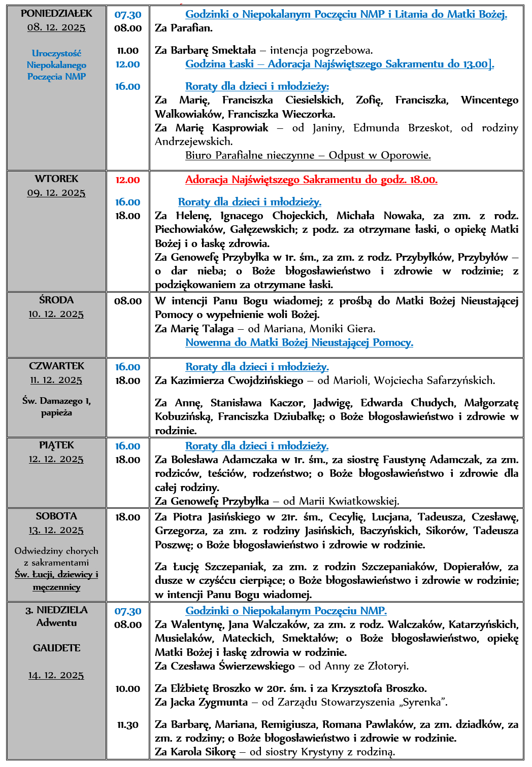 INTENCJE MSZALNE 08. 12. – 14. 12. 2025r.