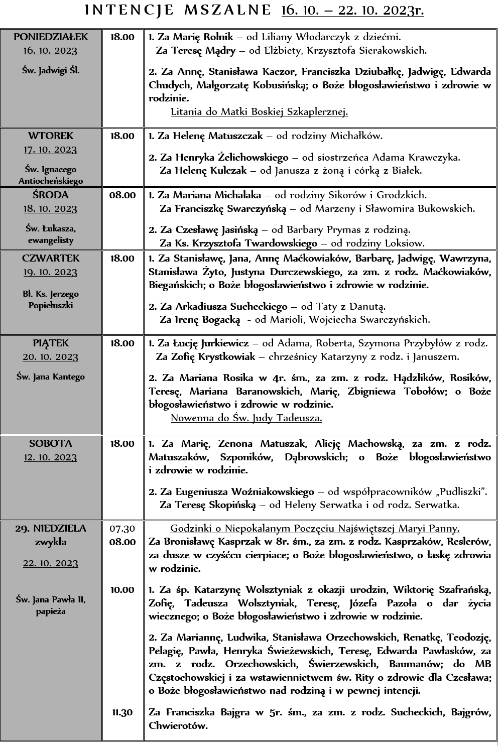 INTENCJE MSZALNE 16. 10. – 22. 10. 2023r.