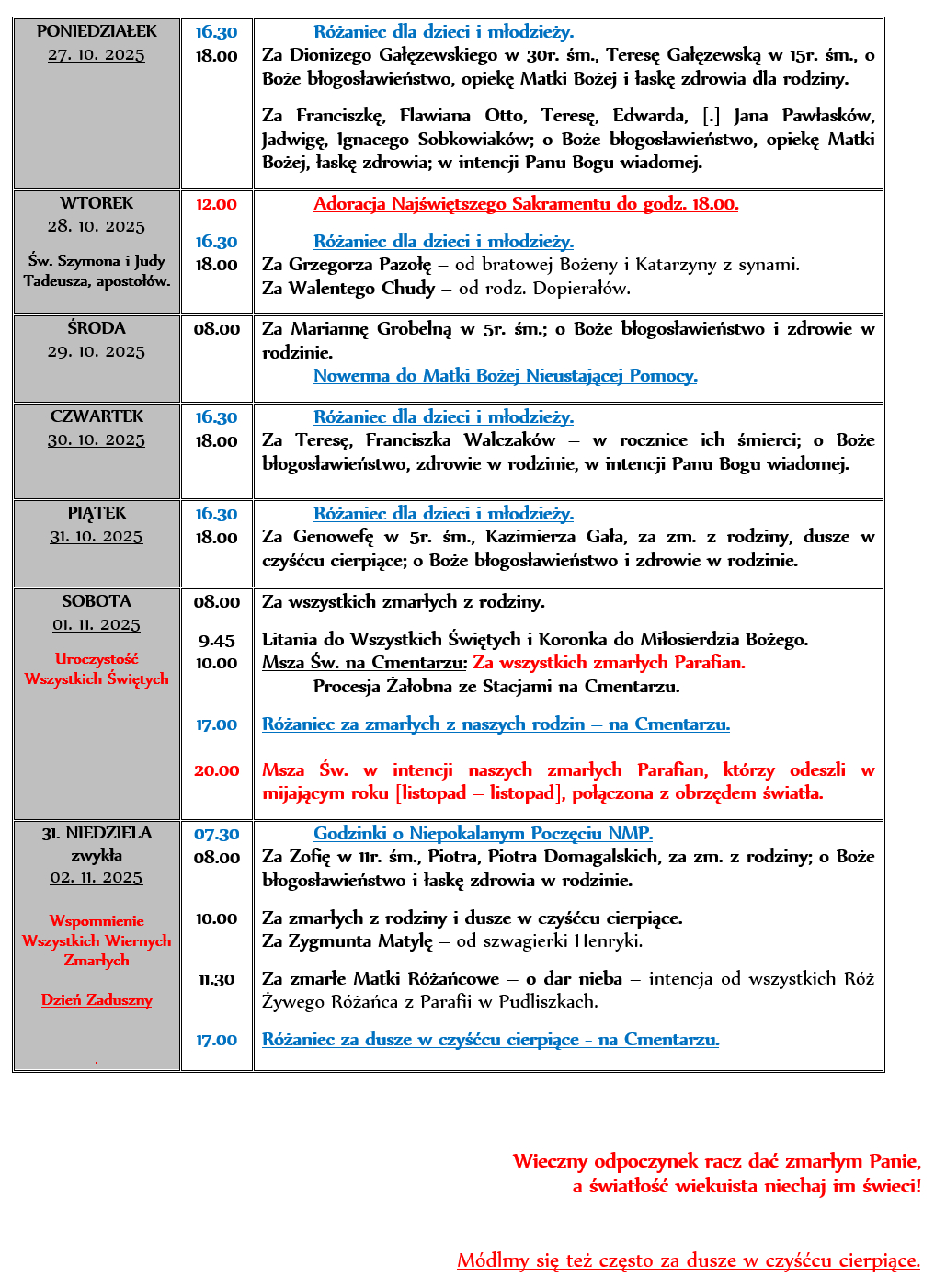 INTENCJE MSZALNE 27. 10. – 02. 11. 2025r.