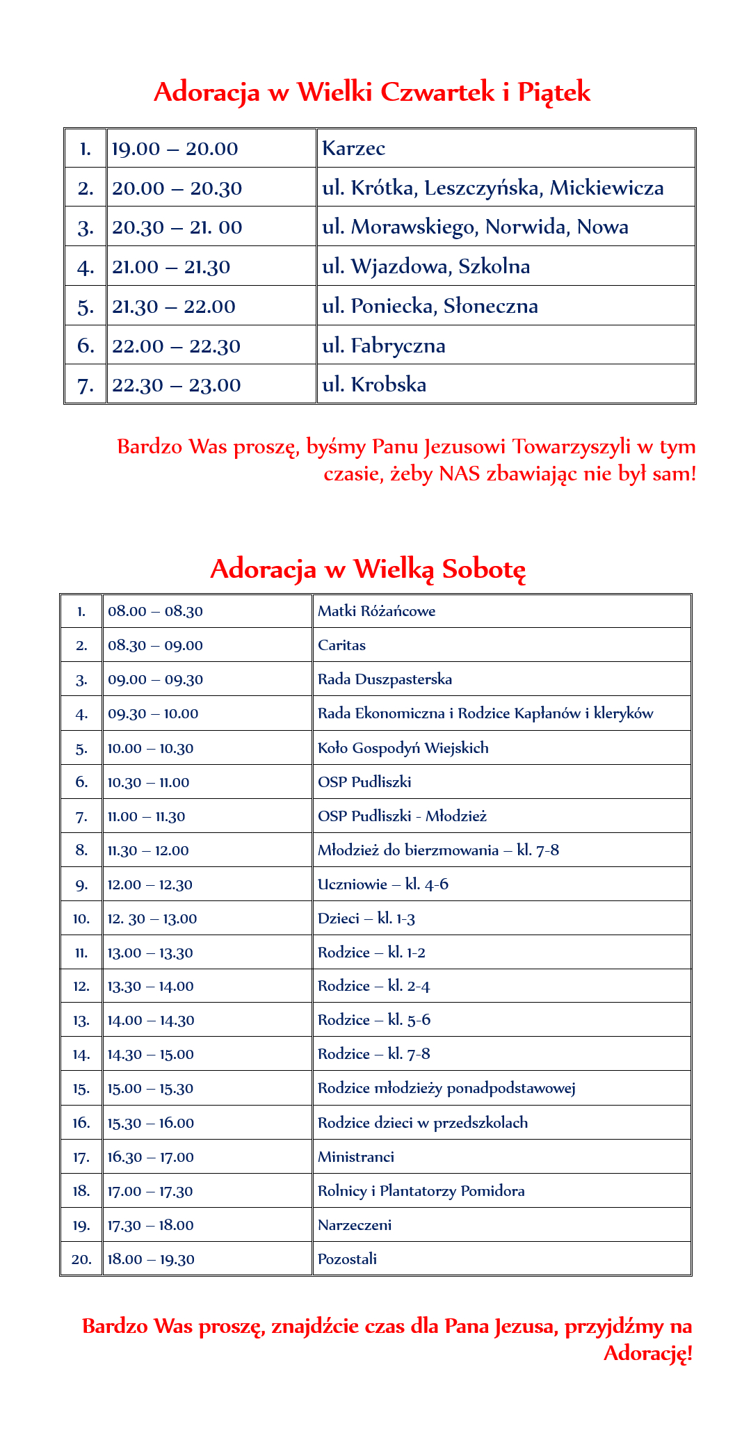 Plan Adoracji - Wielki Czwartek i Piątek, Wielka Sobota
