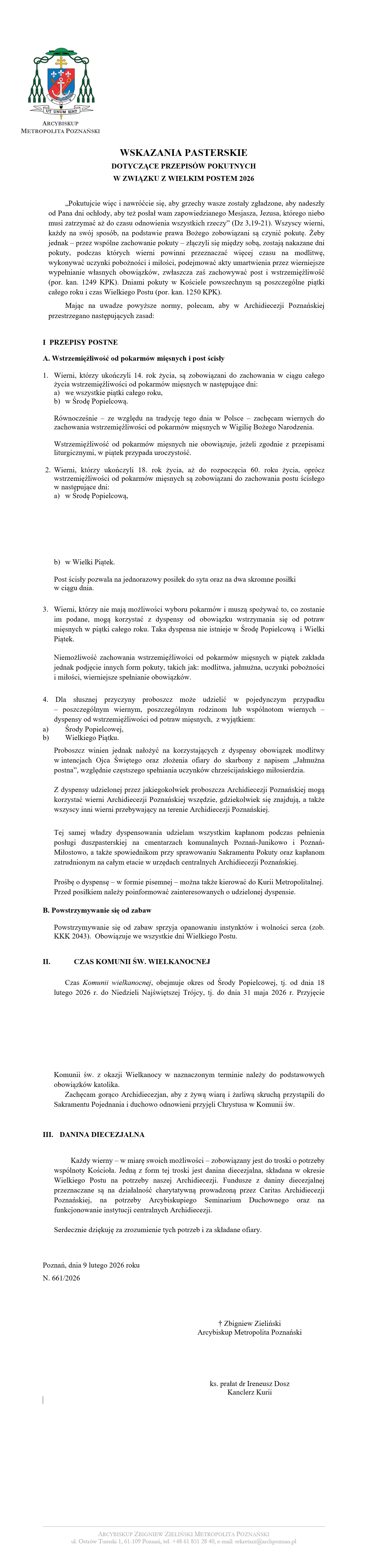 WSKAZANIA PASTERSKIE DOTYCZĄCE PRZEPISÓW POKUTNYCH W ZWIĄZKU Z WIELKIM POSTEM 2026