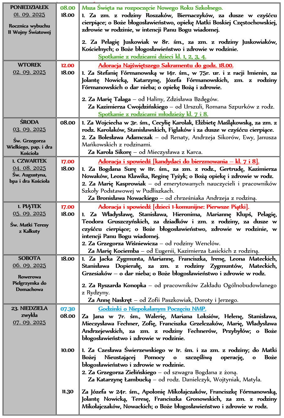 INTENCJE MSZALNE 01. 09. – 07. 08. 2025r.