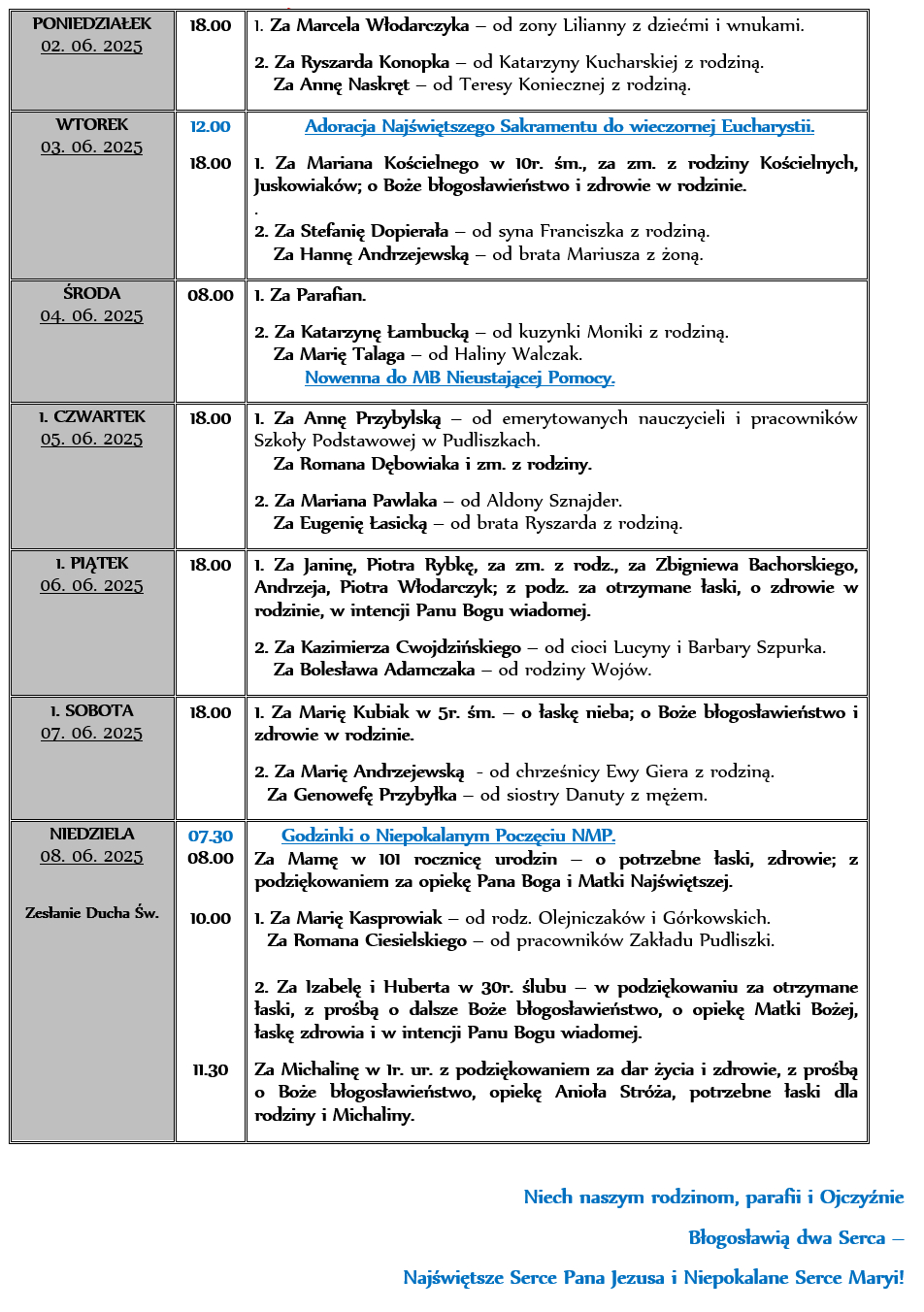 INTENCJE MSZALNE 02. 06. – 08. 06. 2025r.