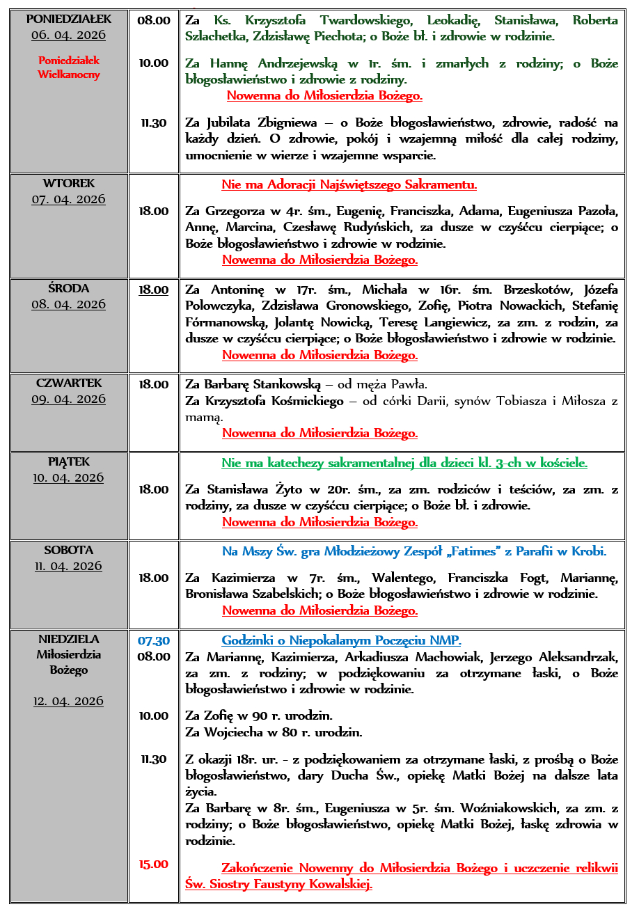 INTENCJE MSZALNE 06. 04. – 12. 04. 2026r.