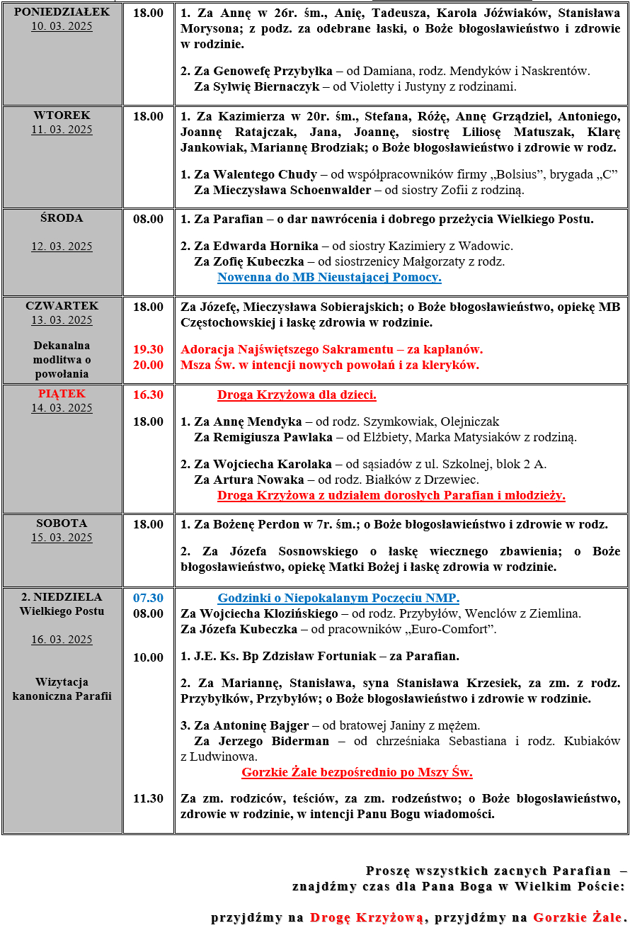 INTENCJE MSZALNE 10. 03. – 16. 03. 2025r.