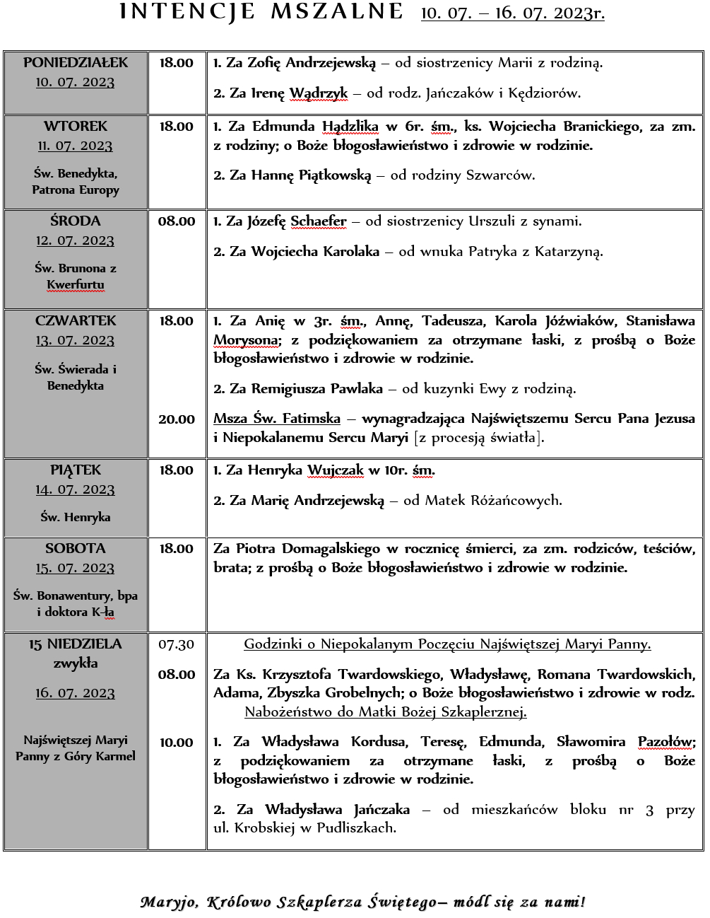 INTENCJE MSZALNE 10. 07. – 16. 07. 2023r.