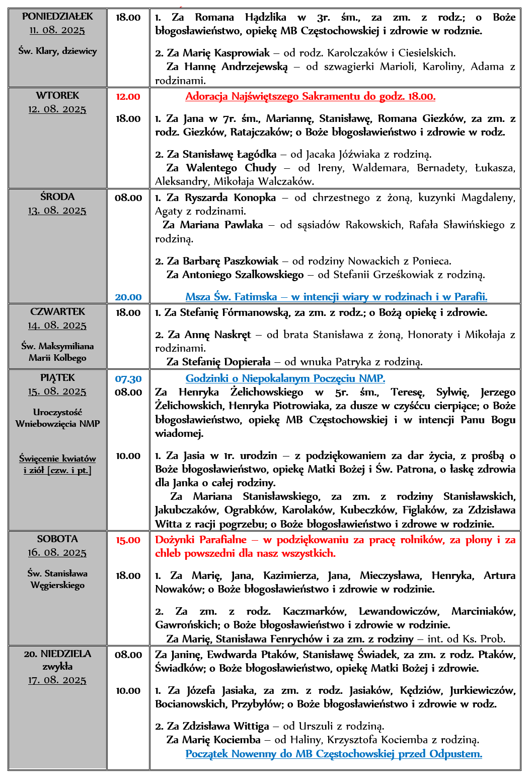 INTENCJE MSZALNE 11. 08. – 17. 08. 2025r.