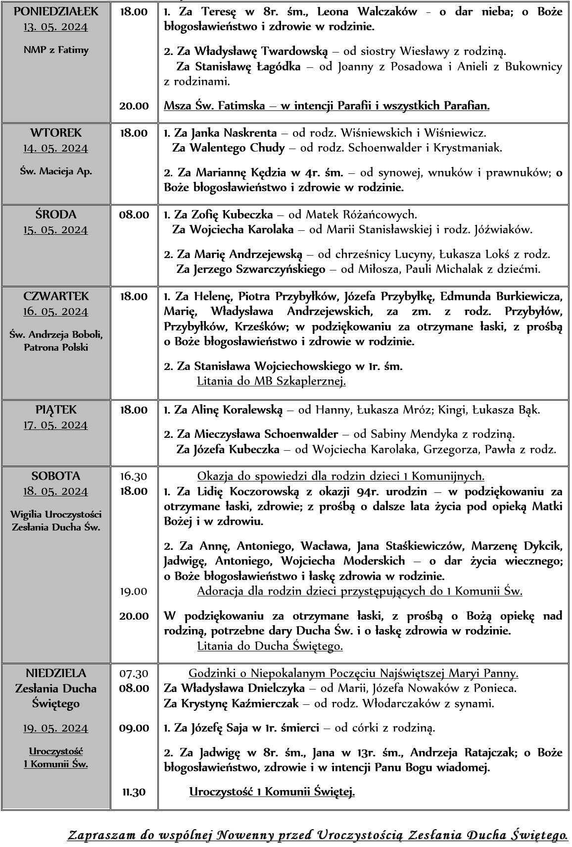 INTENCJE MSZALNE 13. 05. – 19. 05. 2024r.