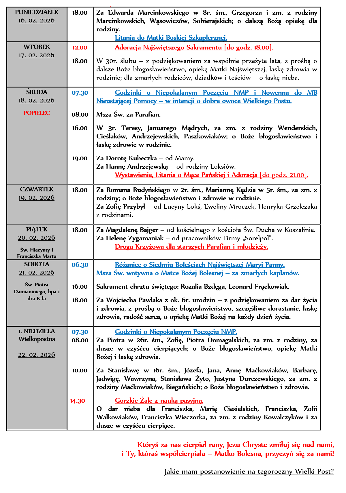 INTENCJE MSZALNE 16. 02. – 22. 02. 2026r.