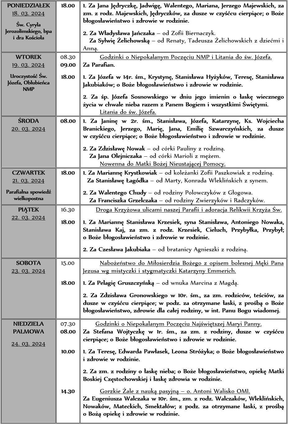 INTENCJE MSZALNE 18. 03. – 24. 03. 2024r.