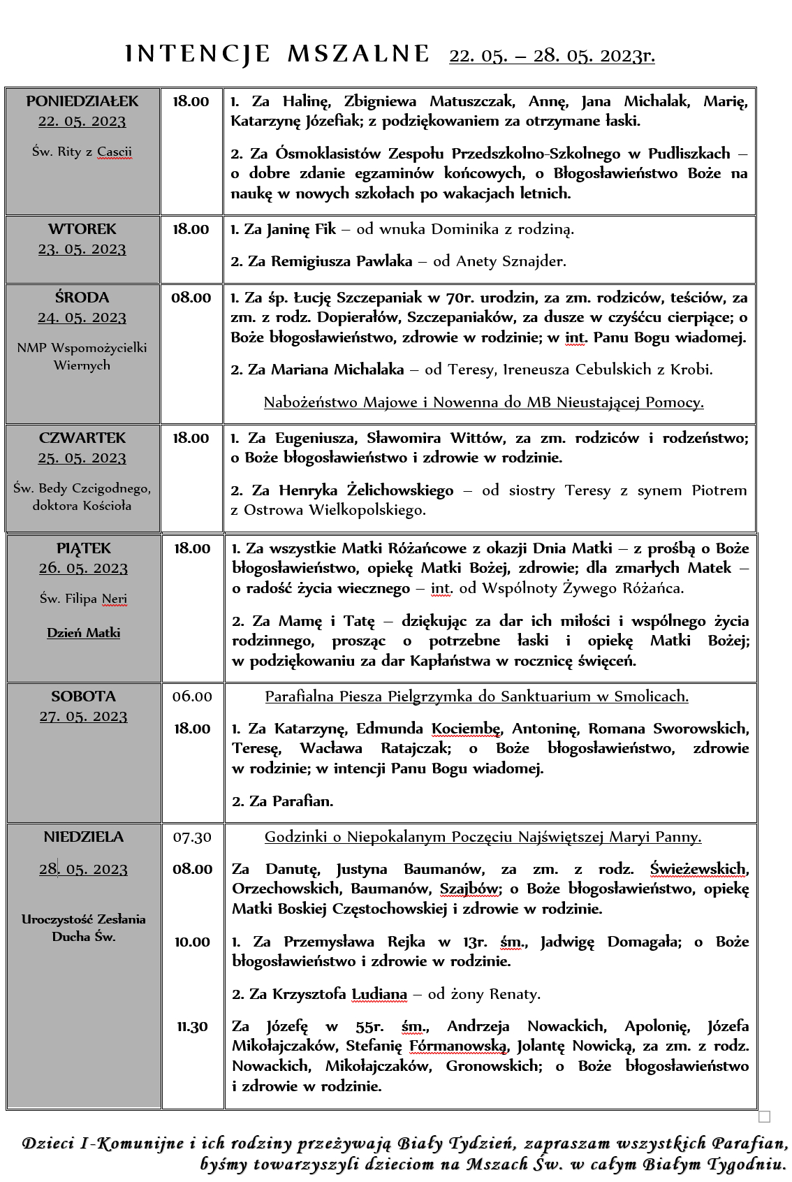 INTENCJE MSZALNE 22. 05. – 28. 05. 2023r.