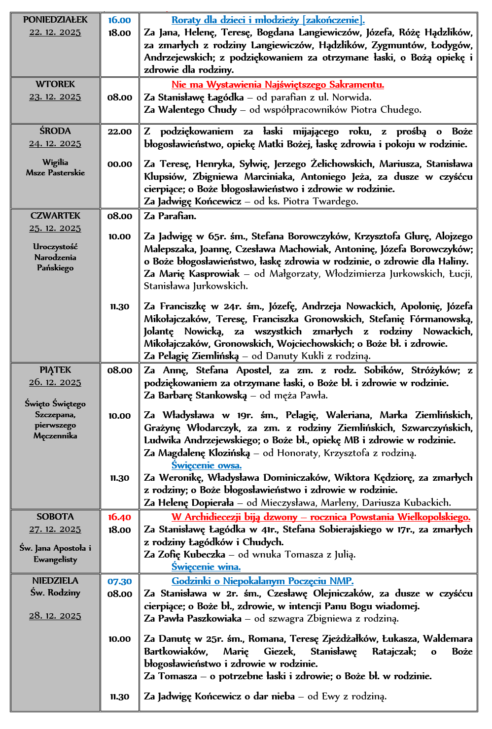 INTENCJE MSZALNE 22. 12. – 28. 12. 2025r.