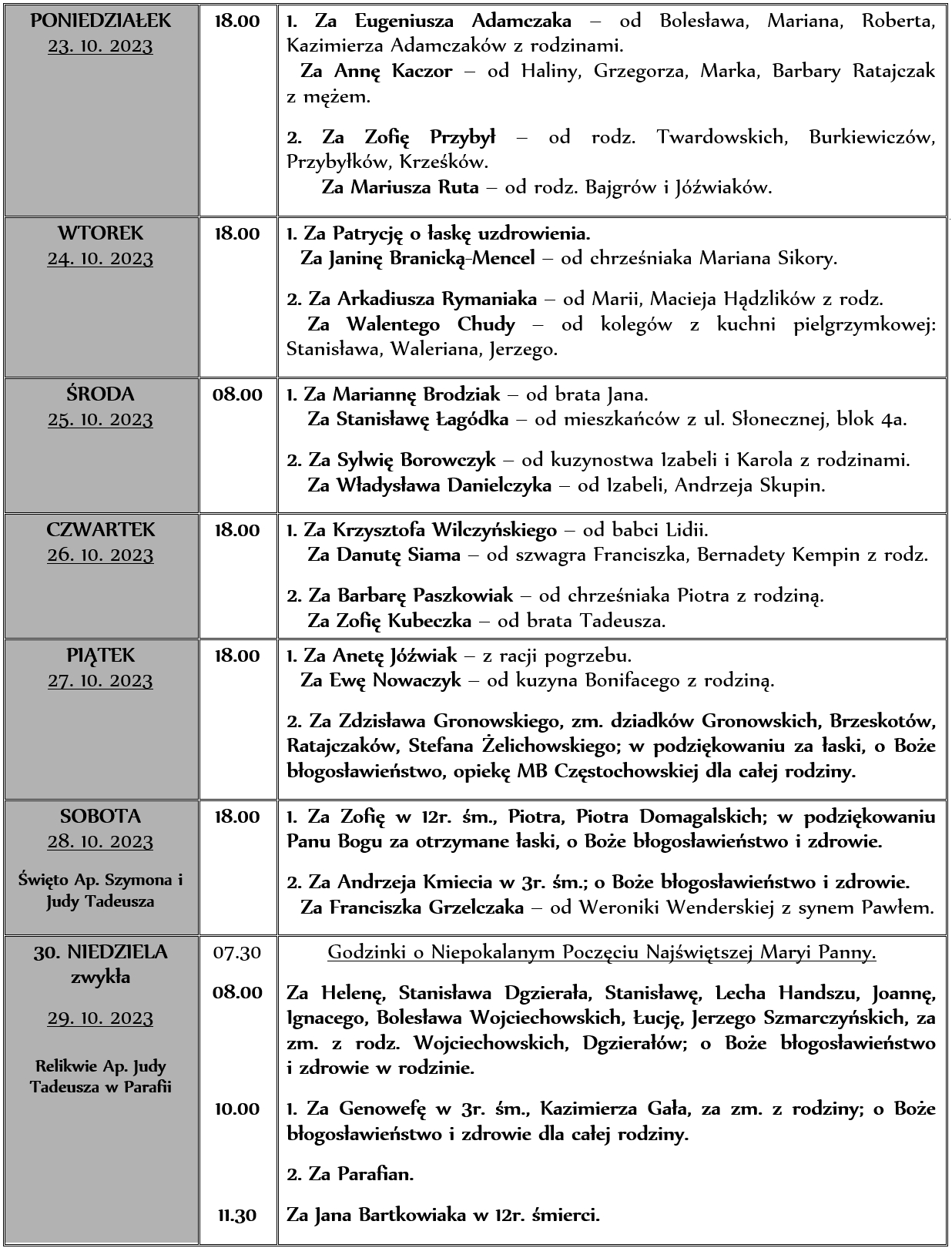 INTENCJE MSZALNE 23. 10. – 29. 10. 2023r.