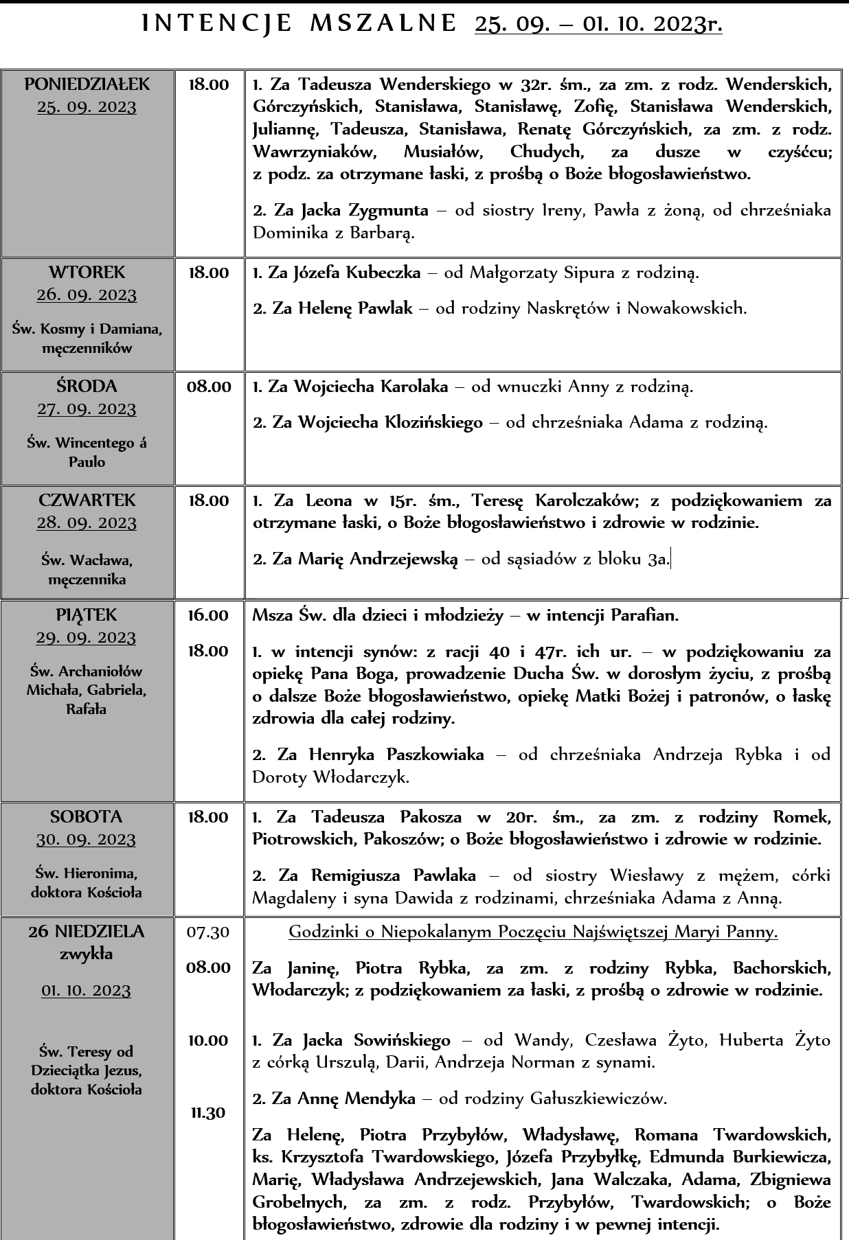 INTENCJE MSZALNE 25. 09. – 01. 10. 2023r.
