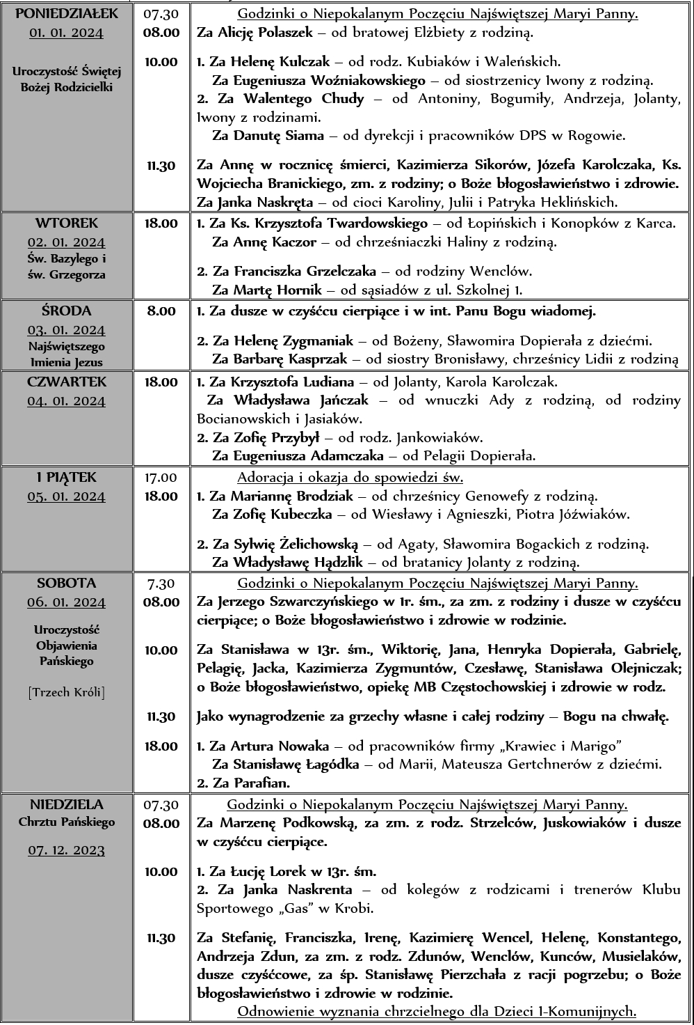 INTENCJE SZALNE 01. 01. – 07. 01. 2024r.